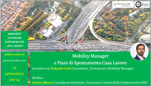 Il primo appuntamento si terrà venerdì 23 settembre, alle ore 14, e tratterà il tema: “Mobility Manager e Piani di Spostamento Casa Lavoro”. Ospite dell’incontro sarà Rolando Cervi, formatore, consulente e Mobility Manager. Modera l’incontro Andrea Merusi dell’Osservatorio HSE.